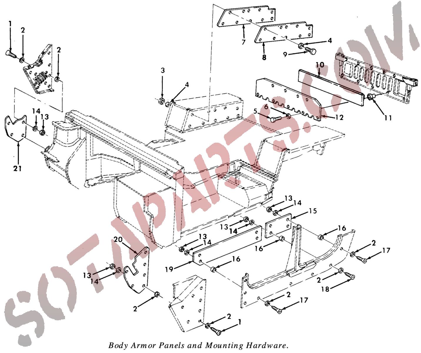 1. Panzerung die für HMMWV's ab Werk eingebaut wurde. Die Platten werden mit Distanzhülsen innen hinter die Karosserie geschraubt.